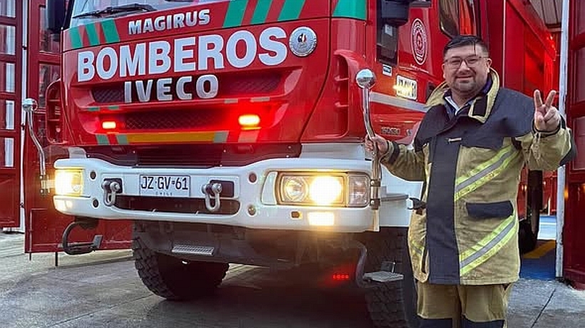 El voluntario Marcelo Árgel Lebtun junto a una de las máquinas de Bomberos de Quemchi. (Cedida)