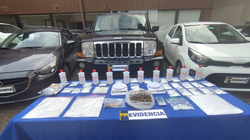 Detectives de la Policía de Investigaciones incautaron más de 3 kilos de clorhidrato, además de dosis de marihuana y hongos, todo avaluado en alrededor de 25 millones de pesos. Los cuatro imputados quedaron en prisión preventiva.