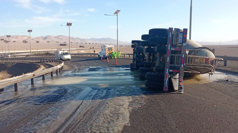 Volcamiento de camión con carga peligrosa en enlace de Ruta 5 Norte provoca derrame de material en Baquedano